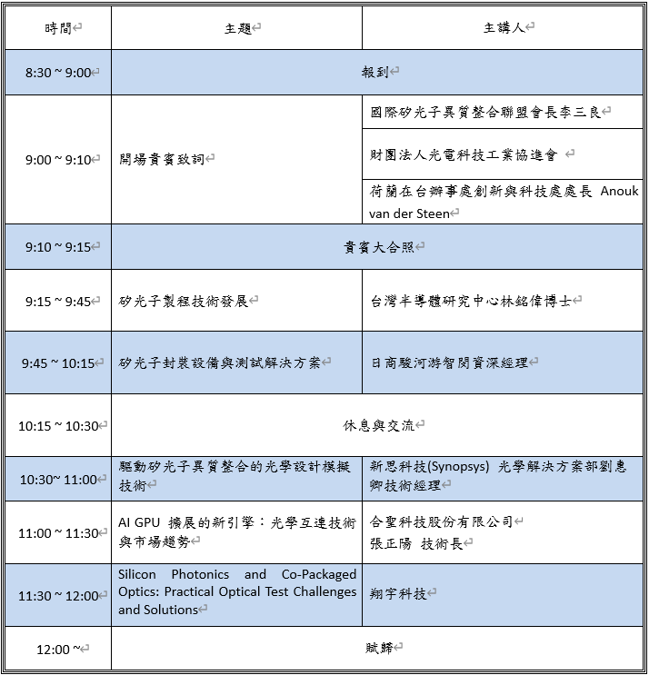 矽光子技術已邁向規模化應用,2025 年更成為資料中心、人工智慧與高效能運算的關鍵驅動力。隨著 CPO興起,矽光子正解決傳輸瓶頸並降低能耗,同時在感測、生醫檢測與自駕車 LiDAR 等領域展現潛力。本論壇將邀集國內外專家與產業代表,分享矽光子於異質整合、測試驗證及新興應用的最新成果,促進跨域合作,加速台灣在全球生態系的布局。