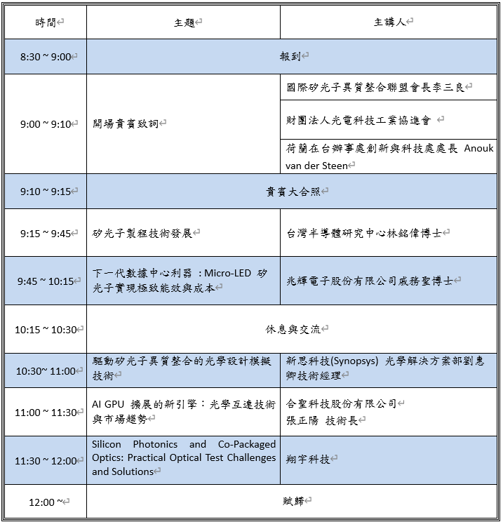 • 協辦單位:國立臺灣科技大學異質整合矽光電晶片研發中心、財團法人光電科技工業協進會(PIDA)